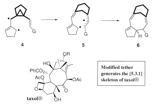 Elaboration of the substrate tether (emboldened in 4), has garnered us access to the [5.3.1] skeleton 6, the substructure prevalent in taxanes. This method is our current strategy in the syntheses of Taxol¨ analogs. ![]()