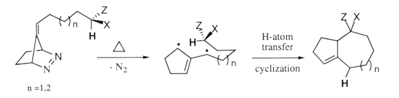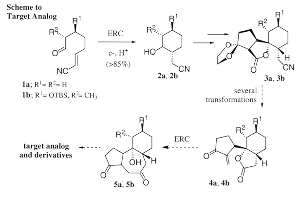 Cyclization experiments of model substrates have provided valuable insight towards the route we are now pursing.4 The ERC of both 1a and 1b routinely generate 2a and 2b (respectively) in 85-90%. Appendage of the cyclopentanone moiety was accomplished via intermolecular reductive coupling with SmI2. The stereochemistry of 3a was confirmed by x-ray crystallography. Investigation of the ERC reaction of substrate 4 is anticipated in the near future.