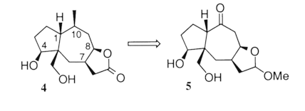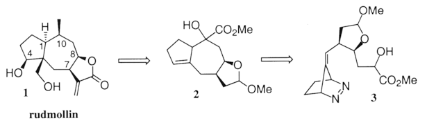 Rudmollin (1), our target of choice, is the major constituent of Rudbeckia mollis Ell., the common coneflower. This pseudoguaianolide exhibits in vivo activity against P-388 lymphoid leukemia.6 The structure and stereochemistry of 1 are well established,7 and only one total synthesis has been reported.8 Our approach is outlined in the retro-synthetic scheme, below. ![]()